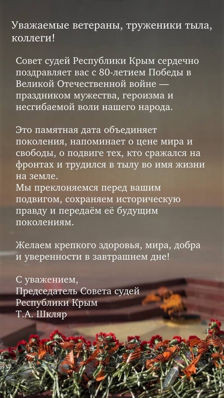 | Поздравление председателя Совета судей Республики Крым Т.А.Шкляр с 80-летием Победы в Великой Отечественной войне | версия для печати |
